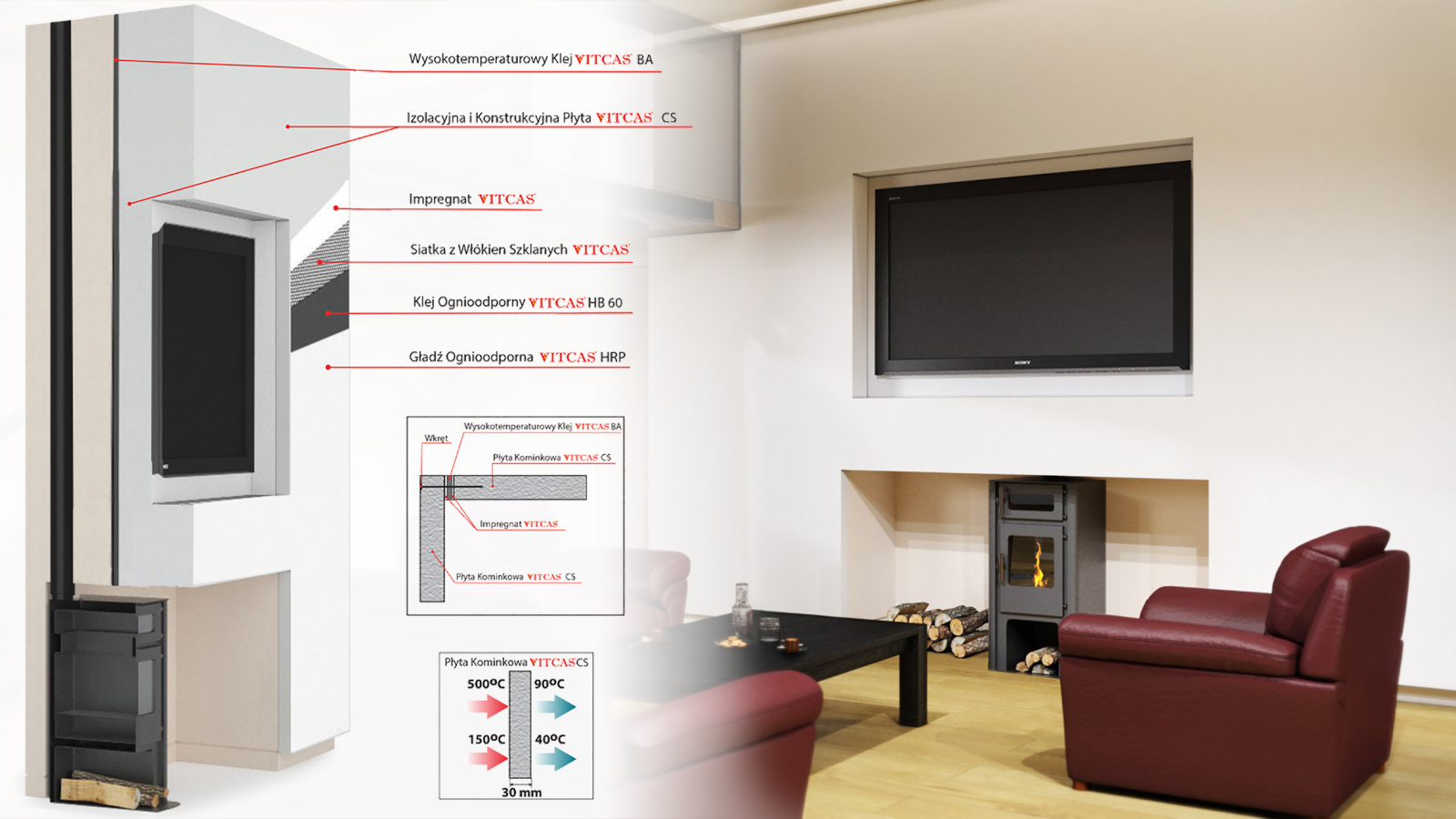 Konstrukcja obudowy powinna być wykonana z wysokotemperaturowej płyty konstrukcyjnej Vitcas CS, która stanowi zarówno izolację jak i podstawę nośną. Płyty łączone są za pomocą wysokotemperaturowego kleju Vitcas BA, łączone krawędzie muszą być pokryte impregnatem. Całość można wykończyć Klejem Vitcas HB60 w którym zatapiamy siatkę oraz Ognioodporną Gładzią Vitcas HRP.