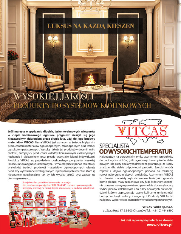 Już dziś w ofercie firmy VITCAS posiadamy ponad 300 produktów z którymi budowa kominka, grilla ogrodowego lub pieca do pizzy to czysta przyjemność połączona z gwarancją najwyższej jakości. Bogaty wybór m.in. zapraw, klejów i uszczelniaczy sprawia, że każdy znajdzie produkt który spełni jego wymagania. Dla wszystkich entuzjastów stylu eko mamy szeroką ofertę pieców chlebowych i do pizzy opalanych drewnem, dzięki którym będą mogli przygotować zdrowe posiłki na świeżym powietrzu ciesząc się towarzystwem przyjaciół i znajomych.